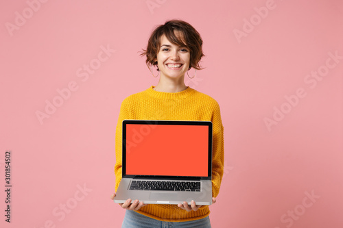 © ViDi Studio, Naklejka premium Smiling young brunette woman girl in yellow sweater posing isolated on pink wall background in studio. People lifestyle concept. Mock up copy space. Holding laptop pc computer with blank empty screen.