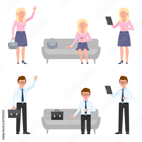 Obraz premium Smiling, young business man and blonde woman vector illustration. Standing side view, waving hello, using tablet, sitting on sofa, waiting office boy and girl cartoon character set on white