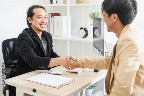 © Queenmoonlite Studio, Obraz premium Smiling young businessman hand shaking with his partner after dealing project at the office.