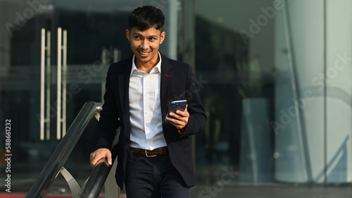 Naklejka premium Smiling young businessman holding smart phone walking up stairs and looking...