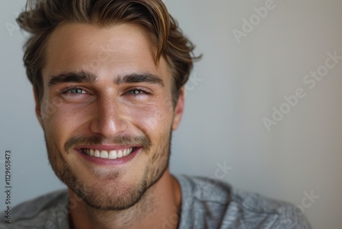 Obraz premium Smiling young Caucasian man in horizontal portrait with copy space.