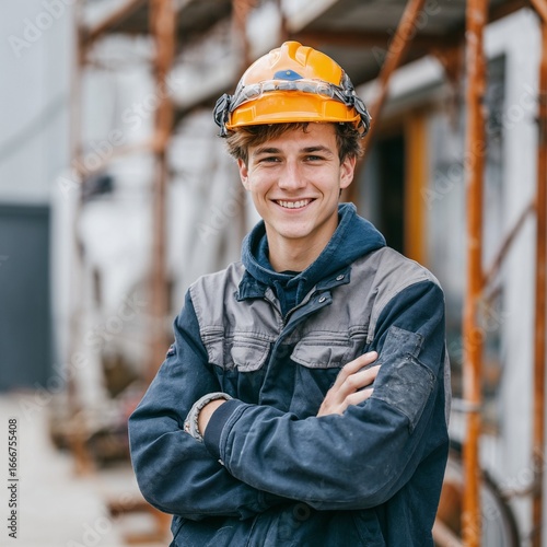 © Tondo, Naklejka premium Smiling young construction worker wearing helmet outdoors