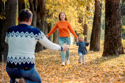 Fototapeta premium Smiling young family running into leaves on an autumns day. active games