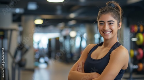 © gn8, Fototapeta premium Smiling Young Female Fitness Trainer in Gym, Embracing Diversity, Ideal for Fitness Posters and Advertisements