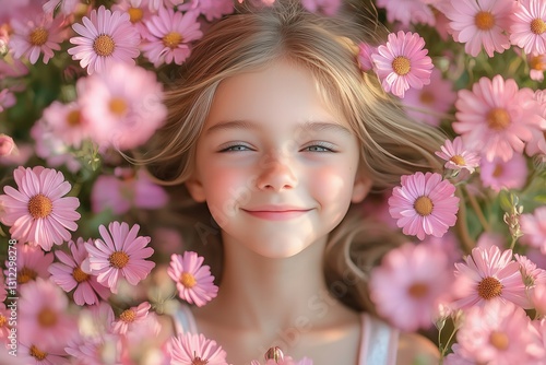 © AltisArt, Fototapeta premium Smiling Young Girl Reclining Amidst Abundant Pink Flowers with Golden Hair and Radiant Expression