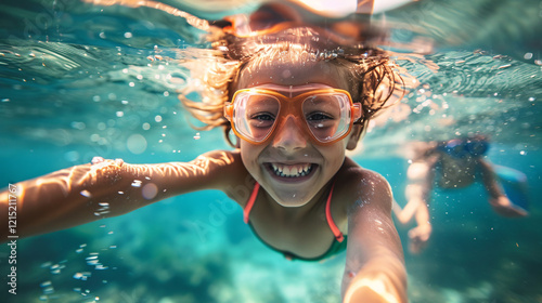 Fototapeta premium Smiling young girl wearing orange goggles enjoys a sunny swim underwater