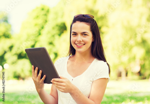 © Syda Productions, Fototapeta premium smiling young girl with tablet pc sitting on grass