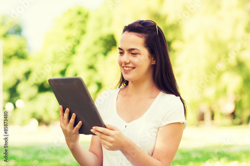 © Syda Productions, Fototapeta premium smiling young girl with tablet pc sitting on grass