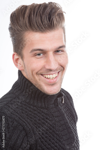 © StudioLaMagica, Obraz premium smiling young handsome man in black sweater