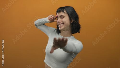 © Krakenimages.com, Fototapeta premium Smiling young hispanic woman making peace sign near eye in studio against orange wall; serenity joy.