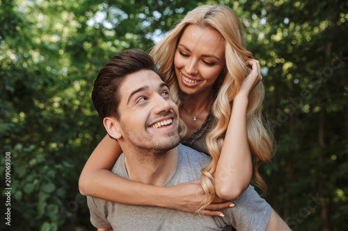 Fototapeta premium Smiling young man carrying his pretty girlfriend on his back
