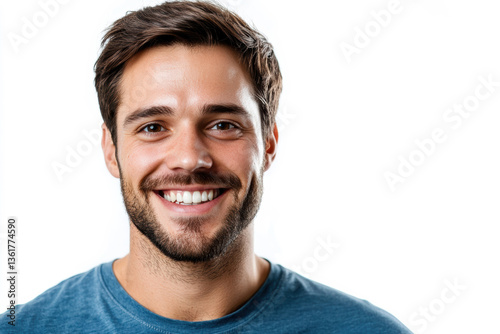 © TENphoto, Obraz premium Smiling young man in blue shirt with natural light background