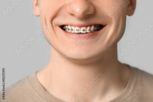 Obraz premium Smiling young man with dental braces on light background, closeup