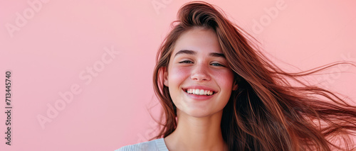 © SnowElf, Fototapeta premium Smiling young pretty woman with brunette brown long groomed hair isolated on pastel flat pink background with copy space. Perfect hair care products banner template, hair salon.