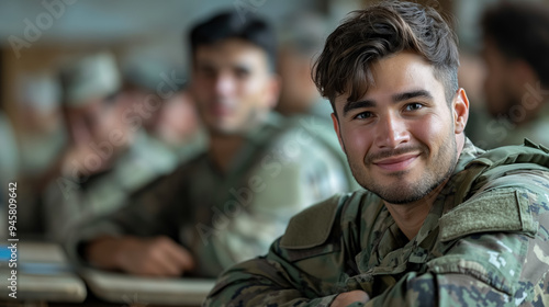 Fototapeta premium Smiling young soldier in uniform sitting among fellow servicemen, exuding...