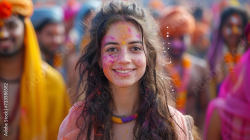 Obraz premium Smiling Young Woman Celebrating Holi Festival With Colorful Powder on Her Face in India