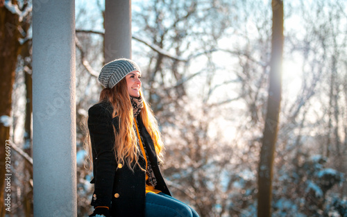 Obraz premium Smiling young woman during walk in the winter park at sunny day