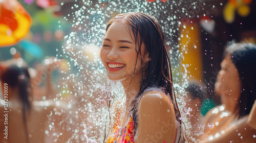 © iiNut_Studio, Obraz premium Smiling young woman enjoying a refreshing shower in winter atmosphere