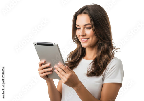 © MdMashud, Fototapeta premium Smiling young woman holding a tablet computer isolated on transparent background