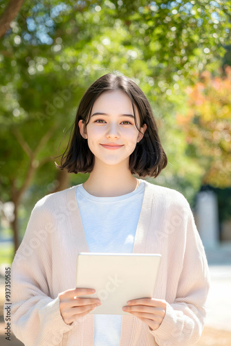 © sujeong, Fototapeta premium Smiling Young Woman Holding Tablet in Modern Bright Interior