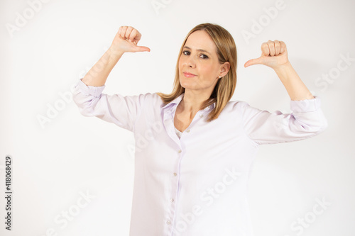 © Danko, Fototapeta premium Smiling young woman in casual clothes posing isolated over white background. People sincere emotions lifestyle concept. Mock up copy space. Pointing thumbs on herself.