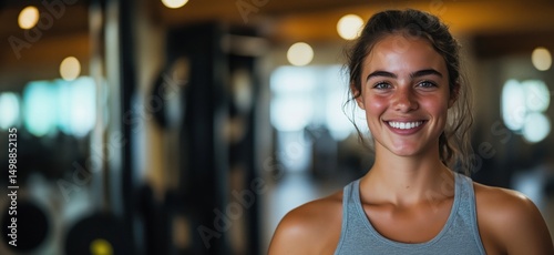 © Vergiliy, Fototapeta premium Smiling young woman in fitness center showcasing healthy lifestyle and confidence