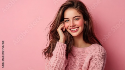 Fototapeta premium Smiling Young Woman in Soft Pink Sweater