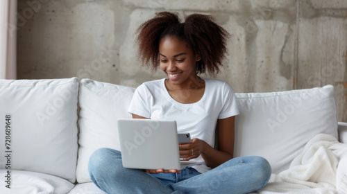 Naklejka premium smiling young woman is comfortably seated on a couch, looking at a tablet while holding a smartphone in her other hand
