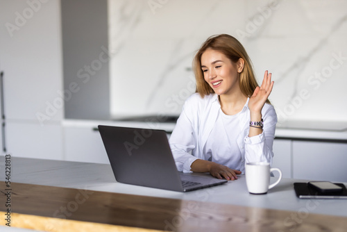 Obraz premium Smiling young woman making video call and heaving a breakfast in her kitchen.