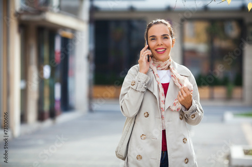 © bokan, Fototapeta premium Smiling young woman on the street talking on the phone