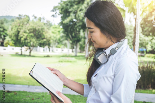 © Freedomz, Fototapeta premium smiling young woman reading the book and sitting on the grass in autumn park