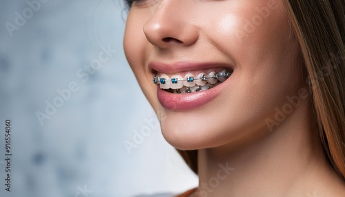 Fototapeta premium Smiling young woman showcasing her braces, highlighting dental care and...