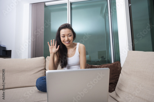 Naklejka premium Smiling young woman waving in front of laptop on sofa