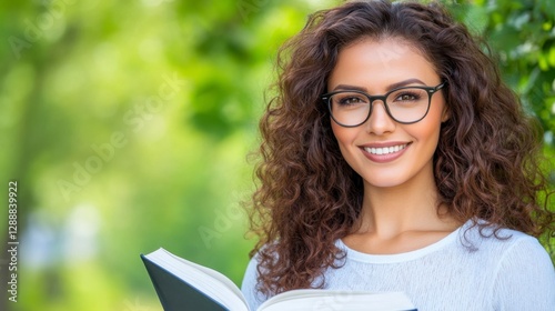 © A4719, Obraz premium Smiling young woman with curly brown hair wearing glasses holds a book outdoors, bright green background, natural daylight