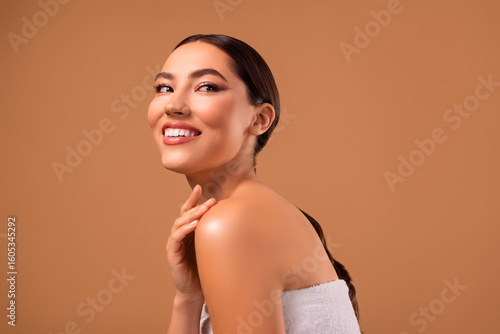 Obraz premium Smiling young woman with flawless skin and elegant hairstyle posing in a...