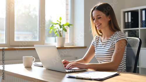 © KawaiiBear Studio​, Obraz premium Smiling Young Woman Working in Modern Office, Minimalist Desk with Laptop and Coffee, Bright Sunlight