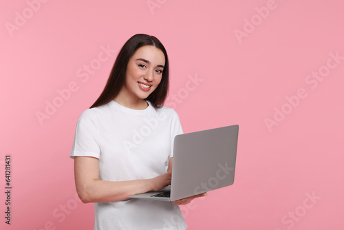 Naklejka premium Smiling young woman working with laptop on pink background, space for text