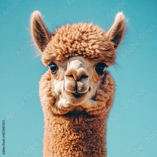 © Iryna, Fototapeta premium Smilling alpaca on blue background, close-up, space for text