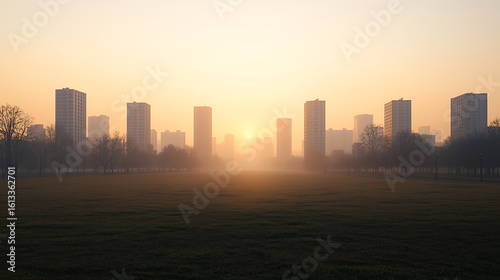 © Alista65, Fototapeta premium Smog and PM 2.5 for urban concept. City skyline at sunset with silhouettes of buildings and trees in the foreground.