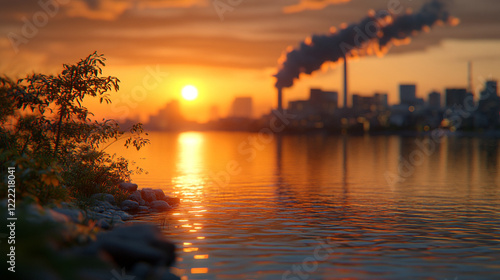 Naklejka premium Smoke and pollution rising from a large coal power plant symbolizing climate...
