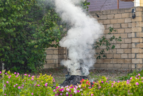 © Vastram, Fototapeta premium Smoke from a fire when burning dry grass in a garden plot