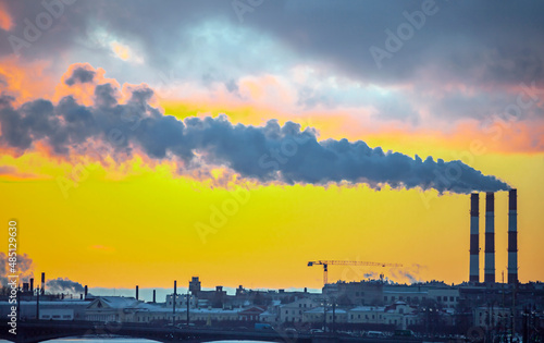 © okyela, Obraz premium Smoke from industrial chimneys and a heavenly landscape at sunset.