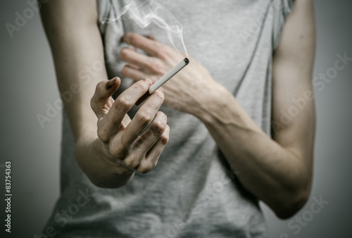 © Alex, Fototapeta premium smoker holds the cigarette in his hand in the studio