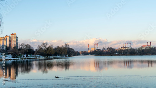 © kalyanby, Fototapeta premium Smoking chimneys of a thermal power plant against a winter cloudy sky. Ecological problems concept. Space for text.