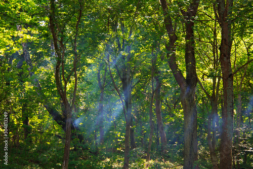 © Renar, Obraz premium Smoky sunshine rays passing through tree branches in the forest.