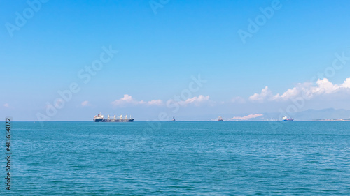 Fototapeta premium Smoky view from sea on distant cargo ships near Cebu city, Philippines