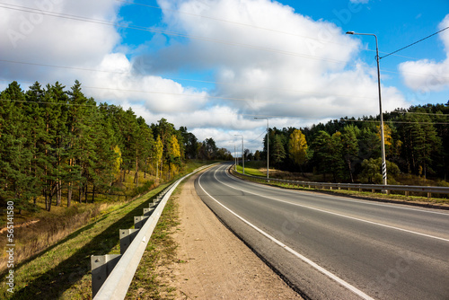 © PhotoChur, Fototapeta premium Smooth curve of a turning empty car road surrounded by pines