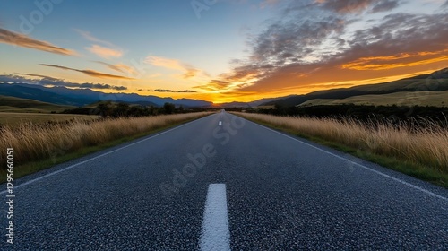 Fototapeta premium Smooth empty road stretching towards a vibrant sunset surrounded by lush...