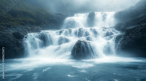 Fototapeta premium Smooth flowing water over jagged black rocks, soft white streaks from slow...