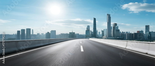 Fototapeta premium Smooth highway leading to modern city skyline under bright sun